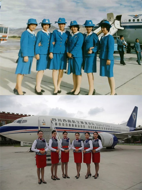 近日,四川西南航空学院的几位“95后”准空姐将自己的照片与“70年代”空姐的照片拼在一起,相同的场景、同样的动作、一样的美丽优雅。从上个世纪70年代到今天,跨越40余年的对比照,透露着民航人对民航精神的传承,同时也反映出我国民航事业的巨大发展。