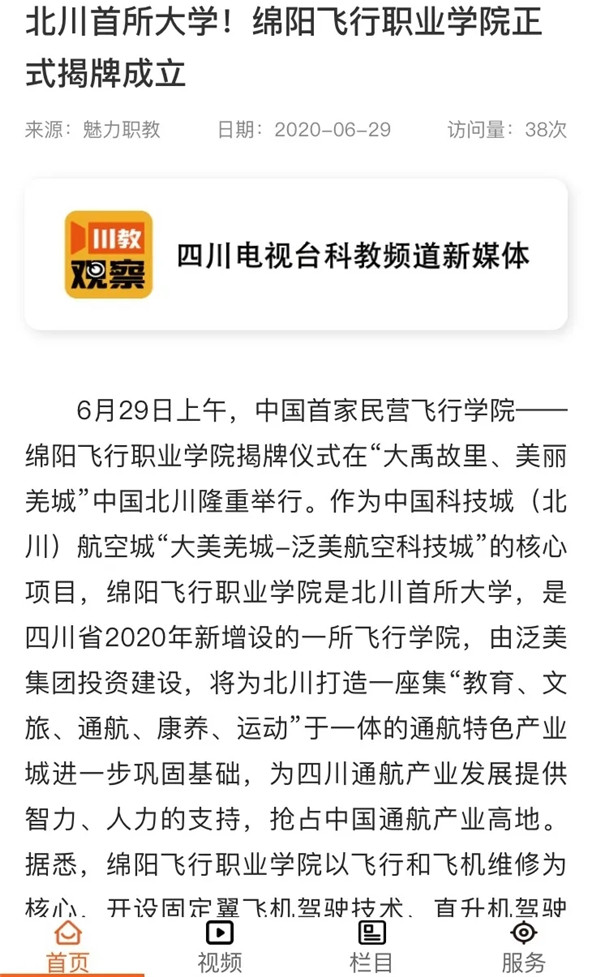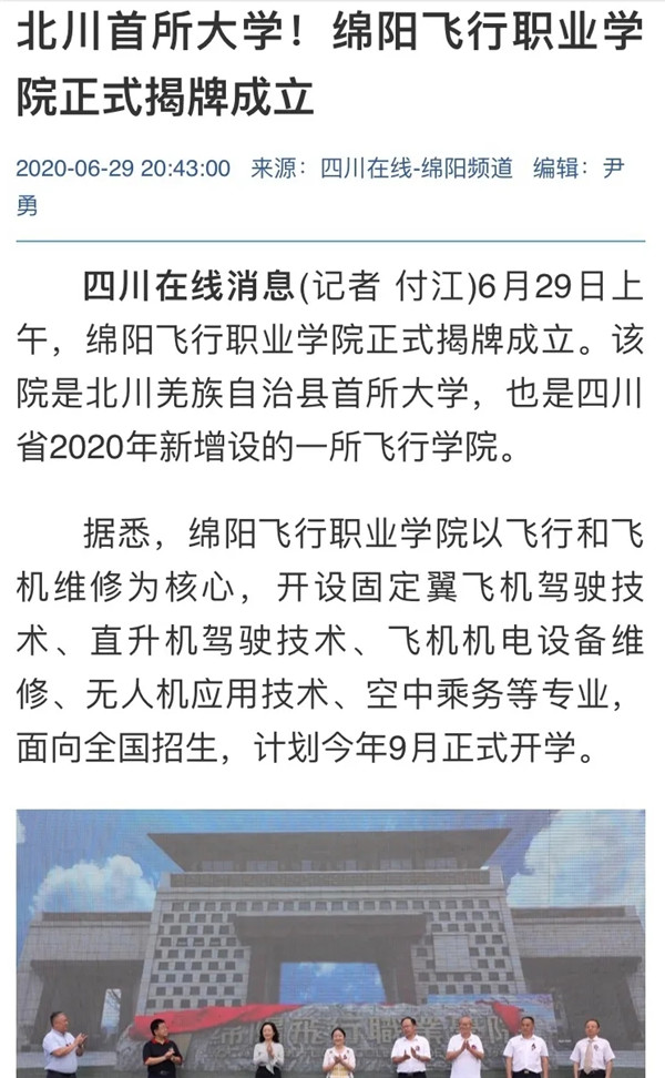 对于绵阳飞行职业学院的揭牌成立