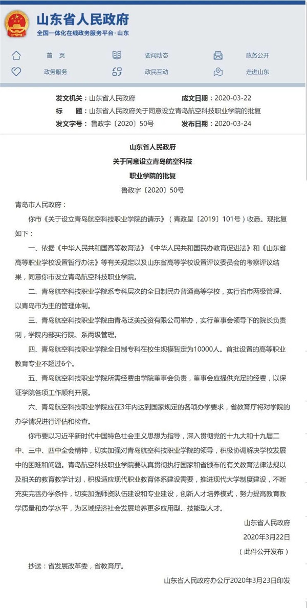 近日,依据《中华人民共和国高等教育法》、教育部《高等职业学校设置标准(暂行)的通知》和《山东省高等职业学校设置暂行办法》等相关规定,结合山东省和青岛市经济社会发展需求和高等教育发展实际,山东省人民政府同意青岛市设置青岛航空科技职业学院,这是泛美教育集团在中国北方成立的首所高职学院,也是泛美教育集团2020年继绵阳飞行职业学院以后,获批成立的第二所高职学院。