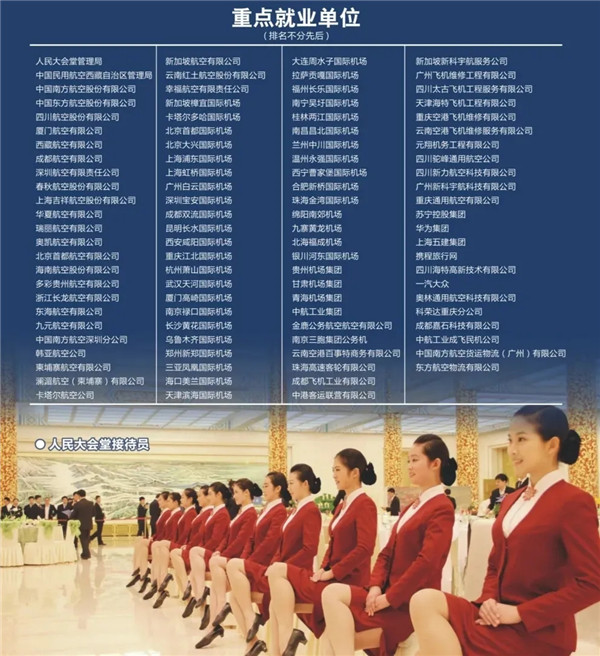 学院所属的泛美教育集团与国内外数百家民航单位建立了紧密合作关系,为学生开辟了广阔的就业渠道,毕业生就业于国际国内航空公司和民航机场,涵盖飞行、乘务、空保、空管、机务维修、安检、贵宾服务、值机等各类民航岗位。