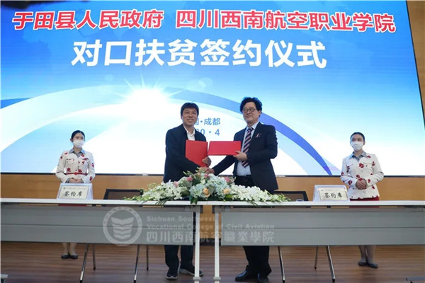 4月28日,四川西南航空职业学院与于田县人民政府对口扶贫签约仪式在成都举行。根据《协议》内容,四川西南航空职业学院将为于田县提供教师培训、领导干部培训,开展航空夏令营活动等。