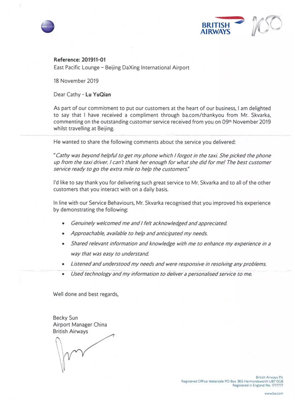 收到感谢信以后,卢宇茜说自己感到非常开心:“乐于助人真的很快乐,特别是那种被别人需要的感觉。很高兴我的工作能够给Skvarka先生带来便利,让他感受到我们的用心服务、热情好客;也很感谢英航总部如此重视这次的事情。”