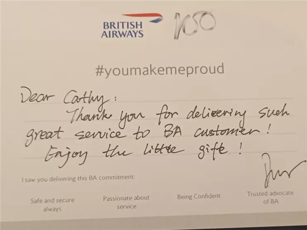 英国航空公司中华区机场经理Bexcky Sun:您的付出完全符合大英航空的服务宗旨……干得很棒,真诚地祝愿你。