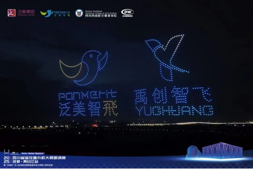 期间,泛美智飞以及旗下禹创智飞的近千架无人机同步升空,以天为幕,以光为笔,呈现了“庆祝环球大师赛十周年”、3D熊猫“花花”以及“泛美集团”标识等绚丽图案,赢得了现场万余观众的阵阵掌声。