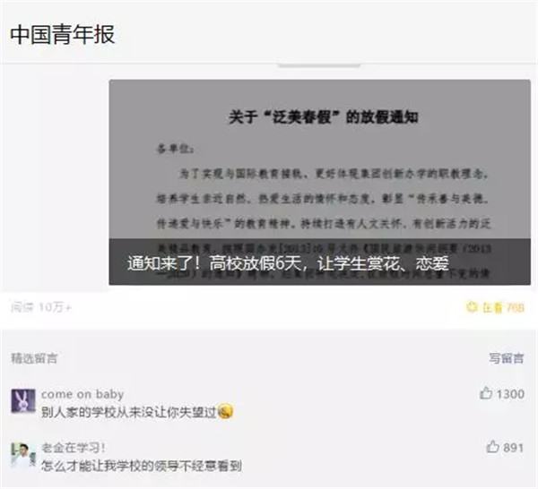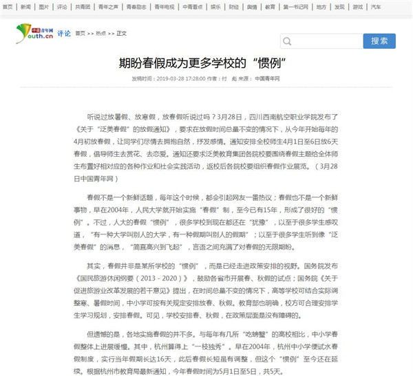 【中国青年网评论:期盼春假成为更多学校的“惯例”】