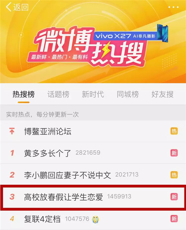 3月28日19:00 话题“高校放春假让学生恋爱”以第3的排名登上微博热搜榜。