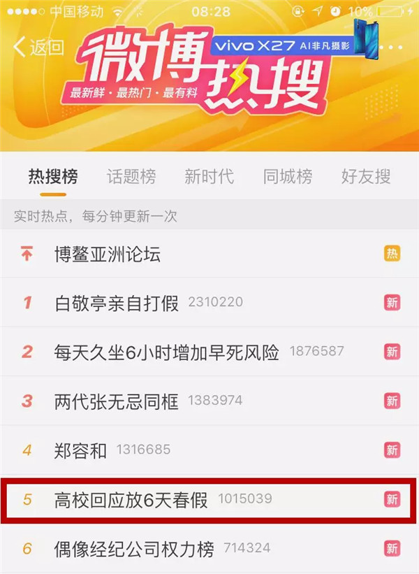 3月29日8:28 话题“高校回应放6天春假”以第5的排名登上微博热搜榜。