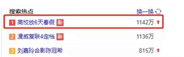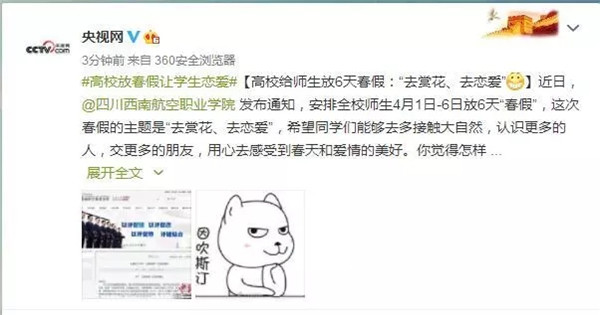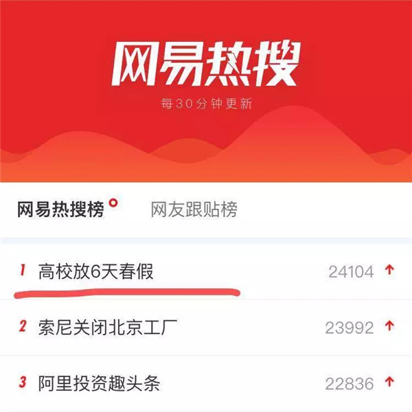 除此之外,在上网输入“高校”两个字,首先出来的就是“高校放6天春假”,可见“泛美春假”这个决定是多么的深得人心。
