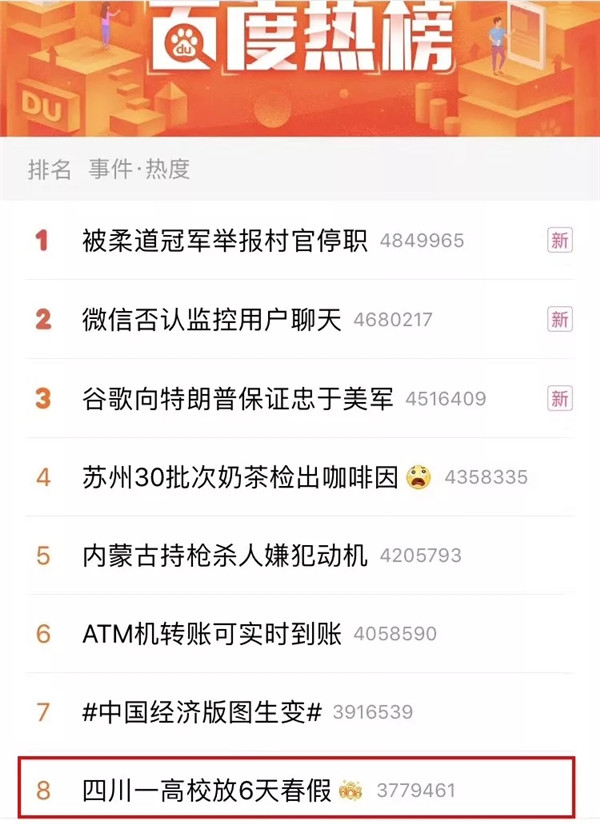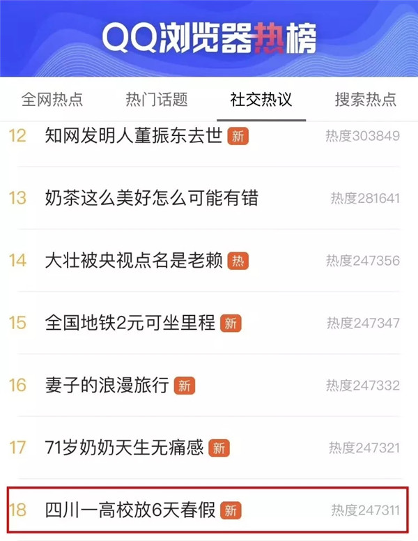 除了微博热搜榜,“四川一高校放6天春假”的话题还登上了其他多个新闻客户端的头条推送、热搜版……