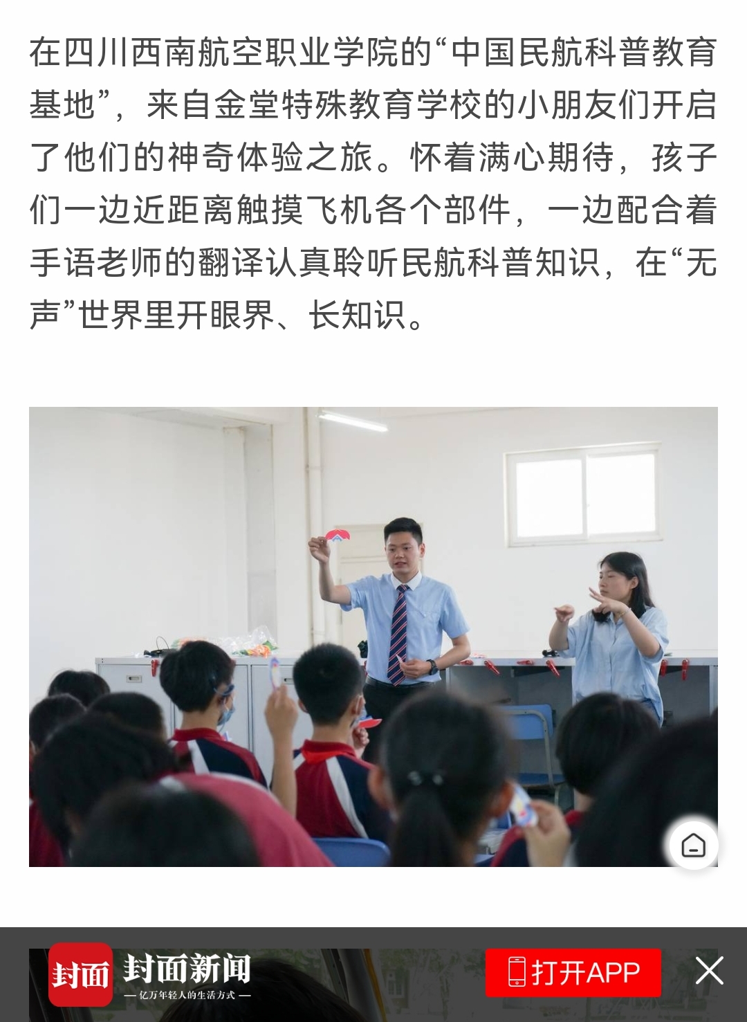 在四川西南航空职业学院的“中国民航科普教育基地”,来自金堂特殊教育学校的小朋友们开启了他们的神奇体验之旅。怀着满心期待,孩子们一边近距离触摸飞机各个部件,一边配合着手语老师的翻译认真聆听民航科普知识,在“无声”世界里开眼界、长知识。