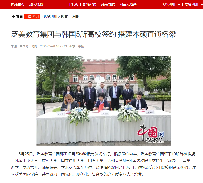 5月25日,泛美教育集团韩国项目签约暨授牌仪式举行。根据签约内容,泛美教育集团旗下10所院校将携手韩国中央大学、庆熙大学、国立仁川大学、白石大学、清州大学5所韩国名校展开交换生、短培生、留学、游学、学历提升、师资培养、学术交流等全方位、多渠道的双向合作项目,依托双方合作院校的资源优势,建立泛美国际学院,共同致力于国际化、现代化、复合型的高素质专业人才培养。