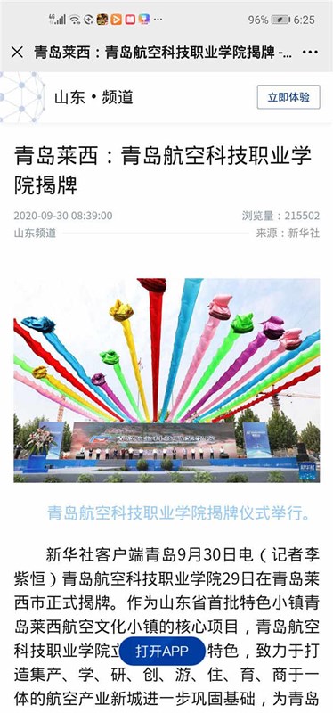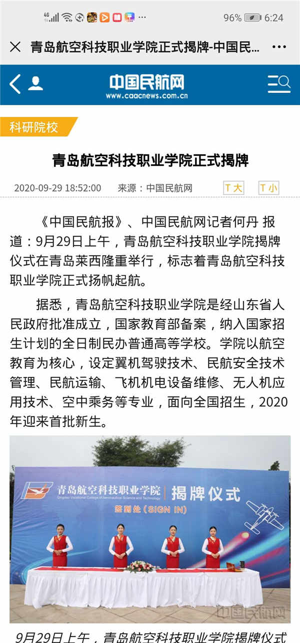 青岛航空科技职业学院以航空教育为核心,设定翼机驾驶技术、民航安全技术管理、民航运输、飞机机电设备维修、无人机应用技术、空中乘务等专业,面向全国招生,2020年已迎来首批新生。