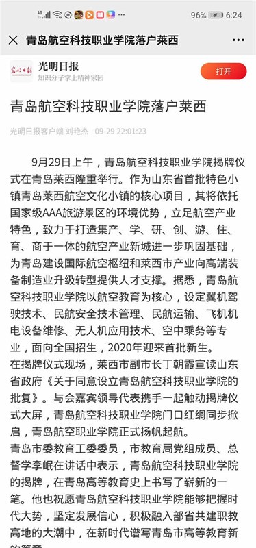 新华社客户端青岛9月30日电(记者李紫恒)青岛航空科技职业学院29日在青岛莱西市正式揭牌。作为山东省首批特色小镇青岛莱西航空文化小镇的核心项目,青岛航空科技职业学院立足航空产业特色,致力于打造集产、学、研、创、游、住、育、商于一体的航空产业新城进一步巩固基础,为青岛建设国际航空枢纽和莱西市产业向高端装备制造业升级转型提供人才支撑。