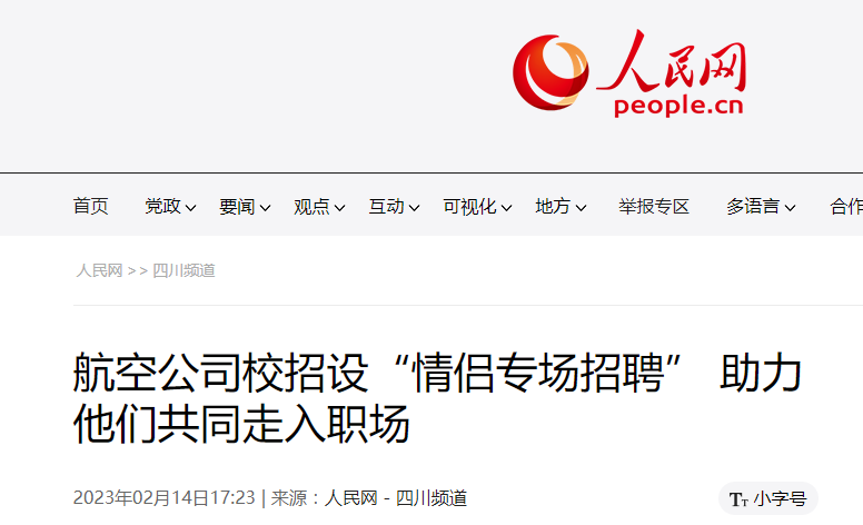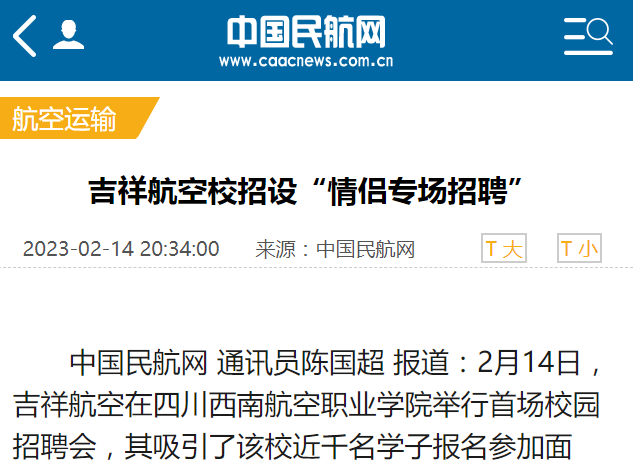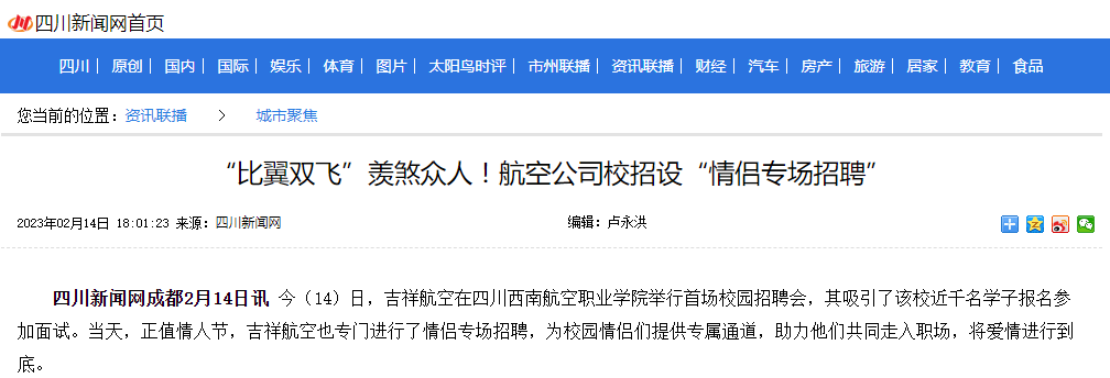 吉祥航空校招设置情侣专场招聘。