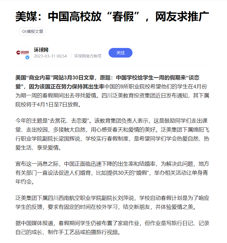 美国“商业内幕”网站3月30日文章,原题:中国学校给学生一周的假期来“谈恋爱”,因为该国正在努力保持其出生率 中国的9所职业院校希望他们的学生在4月份为期一周的春假期间出去寻找爱情。四川泛美教育投资集团近日发布通知,其下属院校将于4月1日至7日放假。