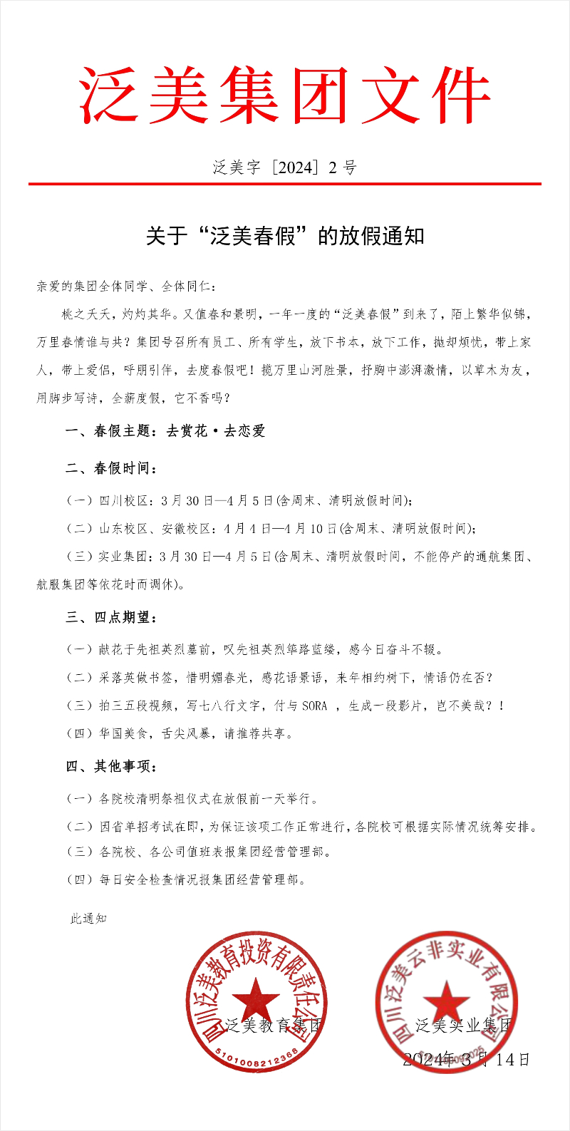 桃之夭夭,灼灼其华。又值春和景明,一年一度的“泛美春假”到来了,陌上繁华似锦,万里春情谁与共?集团号召所有员工、所有学生,放下书本,放下工作,抛却烦忧,带上家人,带上爱侣,呼朋引伴,去度春假吧!揽万里山河胜景,抒胸中澎湃激情,以草木为友,用脚步写诗,全薪度假,它不香吗?