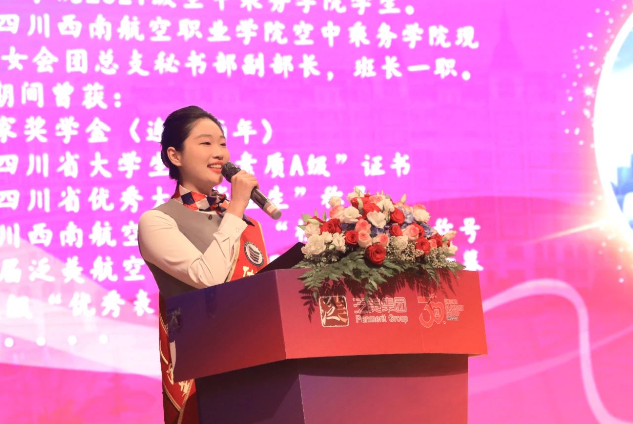 四川西南航空职业学院党委副书记、副院长刘萍宣读表彰决定并致辞。她表示,300名优秀学子经过层层推荐,是闪耀于不同领域的佼佼者,是所有泛美学子的榜样与楷模。她号召所有泛美学子向榜样们学习,保持青年的蓬勃朝气、昂扬锐气、浩然正气,追求更有高度、更有境界、更有品位的人生,让青春绽放绚丽之花,与泛美携手,共同绘制百年泛美的传奇篇章。