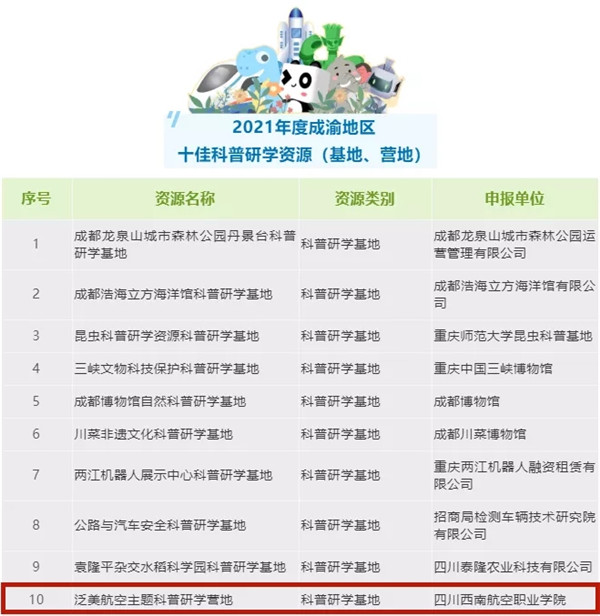 为推动成渝地区科普资源共享,深化成渝地区科技创新合作,10月26日,“2021成渝地区科普创新发展论坛暨科普能力提升培训活动”在重庆举行。在论坛上,四川西南航空职业学院申报的“泛美航空主题科普研学营地”在数百家营地和资源中脱颖而出,被评为“2021年度成渝十佳研学资源”。