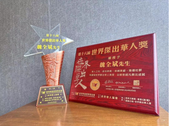 旨在表扬全球华人在世界各地华人社会及对国家的贡献和影响,促进中国与世界各国人民的和谐发展与进步,9月8日,第18届世界杰出华人奖颁奖盛典在香港会议展览中心隆重举行。大会颁发了世界杰出华人奖、世界杰出华人青年企业家奖、世界杰出华人艺术家大奖等奖项。泛美集团创始人、董事局主席魏全斌先生受邀出席并荣获“世界杰出华人奖”。第十一届、十二届政协委员,世界华人协会荣誉主席李小琳女士及原全国政协常委、北京奥运福娃之父韩美林教授为魏全斌先生颁奖。