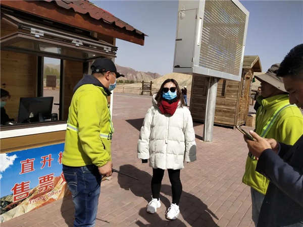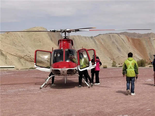 游客乘坐直升机“扶摇直上”,近距离游览彩色丘陵与丹霞地貌和谐交融的壮丽美景,可谓是视觉上的奢侈享受。来自成都的韩女士乘坐完直升机后,兴奋地说:“乘坐直升机看丹霞,视角广阔、色彩斑斓,能够更好地感受丹霞地貌的壮观和气势磅礴,视觉冲击力简直太棒了!”