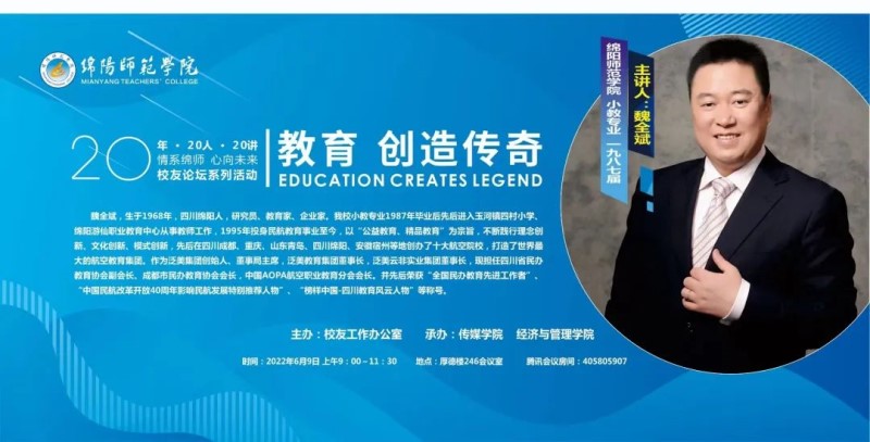 2022年6月9日,由泛美集团董事局主席、泛美教育集团董事长魏全斌先生主讲的题为“教育,创造奇迹”的讲座于绵阳师范学院顺利举办。本场讲座是“情系绵师,心向未来”校友论坛系列活动之一。绵阳师范学院传媒学院、经管学院师生参与聆听本场讲座。
