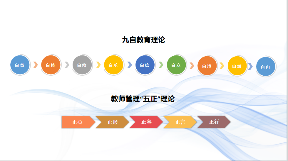 ▲“九自”教育理论、教师管理“五正”理论