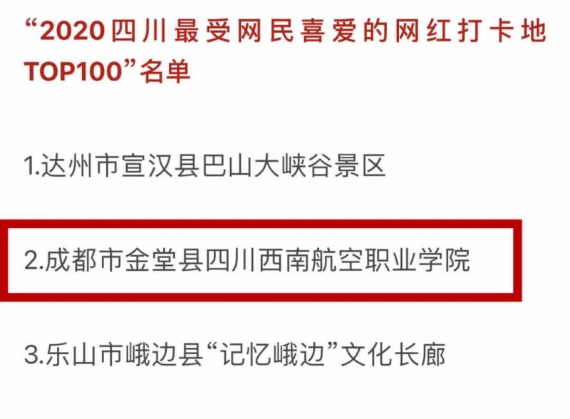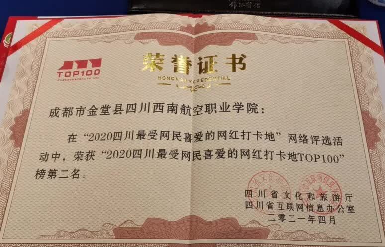 4月26日,由四川省委网信办、四川省文化和旅游厅主办,经千万网友投票产生的“2020四川最受网民喜爱的网红打卡地top100”榜今天在成都正式揭晓,四川西南航空职业学院成功上榜,并在“2020四川最受网民喜爱的网红打卡地top100”中位列第二位,网红打卡地实至名归。