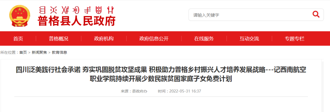 2022年,四川西南航空职业学院在普格县继续招收6名、昭觉县招收4名少数民族脱贫户子女全免费就读,持续开展少数民族民航人才培养战略,拓展凉山职业教育多元化发展渠道。