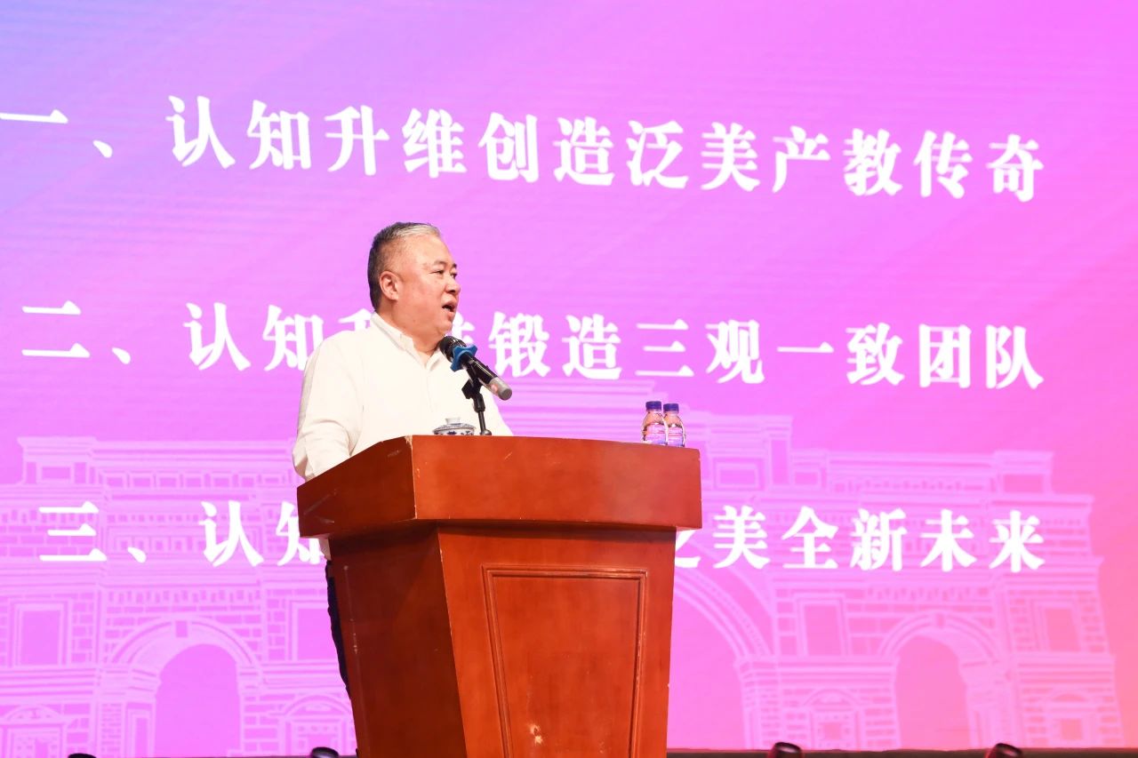 教育品牌、企业品牌的生命力与可持续性,关键在于顶层设计。魏全斌指出,“泛美以后的辉煌需要认知提升的三观一致队伍的持续奋斗。以‘三迭代’为要求,锻造一支产教发展铁军。”每一位泛美人,应深悟和践行云非本学“利他利己,平等共生”价值观,坚定“把教育作为信仰,用教育改变世界,创全球最大公益教育集团”的伟大使命,树立“传奇泛美,实力泛美,百年泛美”的远大愿景,秉承“传承善与美德,传递爱与快乐”的集团精神,发扬以创新文化和奋斗文化为代表的泛美十大文化。