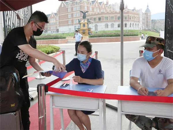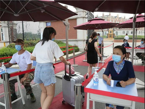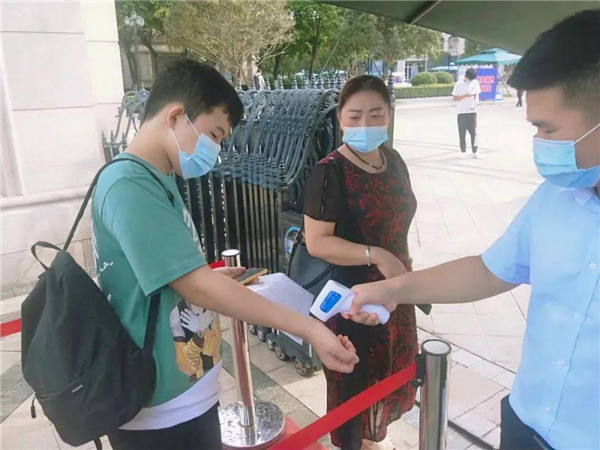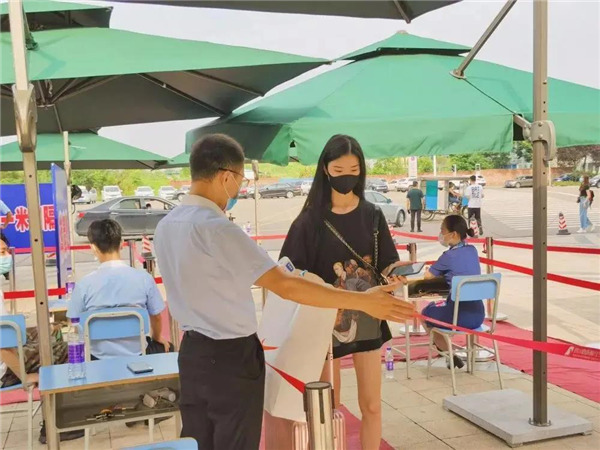 在校门口,安保、防疫工作组严阵以待,对报到新生进行行李消毒、身份确认、健康码、行程卡以及核酸检测报告查验、体温测量与登记等,做好细节,全方位落实防控要求,新生及家长对此也积极配合。