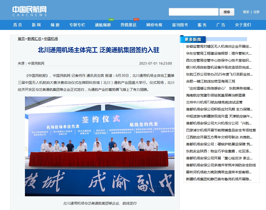 6月30日,北川通用机场主体完工暨第三届中国无人机航拍大赛决赛启动仪式在绵阳科技城(北川)通航产业园盛大举行。仪式现场,北川经济开发区与泛美通航集团等企业正式签约,为通航产业的蓄势腾飞插上了有力翅膀。