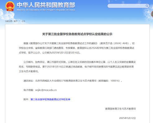 近日,教育部正式发布了《关于第三批全国学校急救教育试点学校认定结果的公示》,经过严格的自主申报、省级教育行政部门遴选推荐以及专家复核程序,宿州航空职业学院入选第三批全国学校急救教育试点学校名单。这一荣誉是对我院长期以来急救教育工作的肯定,也是对我院深入实施“大学生生命教育”的极大鼓舞。